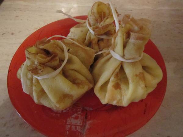 Всеми любимые блины, можно готовить с различными начинками. У меня в данном случае вареные сердца, картофель и вареные яйца, в начинку добавляю капельку майонеза, соль, перец по вкусу. Любим начинку с грибами. Блин собираем в мешочек и перевязываем перышками зеленого лука или ниточкой чечила.