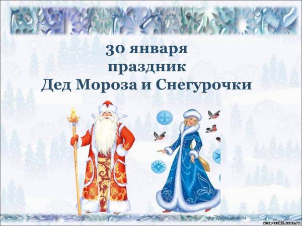 Как много на Руси праздников. И современных, вошедших в нашу жизнь совсем недавно, и древних, славянских, языческих. Одним из таких праздников стал День Мороза и Снегурки. Он отмечается 30 января, был одним из самых популярных ещё в Древней Руси! Раньше в этот день Деда Мороза почитали как зимнее воплощение языческого бога Велеса, который считался защитником материального достатка и благополучия. А про его внучку есть поверье, что, околдованная богиней Лелей, покровительницей влюбленных, Снегурочка полюбила человека. Ее мама – Зима, предостерегала дочь, что теплые человеческие чувства могут погубить ее. Однажды не ушла она со своим отцом Морозом на Северный полюс, влюбившись в молодого красавца. Пригретая солнечными лучами, она растаяла. И повелось с тех давних пор, что теперь каждую зиму 30 января любимые всеми Мороз и Снегурка уходят на Северный полюс, предсказывая тем самым скорый приход Весны. Хороший праздник! А солнышко уже так ярко светит, и лучи его становятся горячими. Значит, весна скоро!