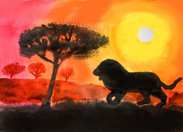 Акварельная композиция "Джунгли зовут!". Первый этап работы - это создание яркого фона. Он должен быть сочным и ярким, передавая жаркую атмосферу Африки. Начинаем с того, что оставляем на листе белое пятно не закрашенной бумаги - это солнце. Затем желтый, оранжевый и красный закрашиваем фон растяжкой от белого до красного. Оттенки красного могут быть любыми. Пока работа сохнет вырезаем шаблоны африканских животных на выбор. Затем рисуем карандашом, без нажима дальний и передний план, дерево и обводим вырезанные силуэты. Заливаем их черной краской. А то, что на заднем плане рисуем более светлым оттенком черного. Добавляем детали.