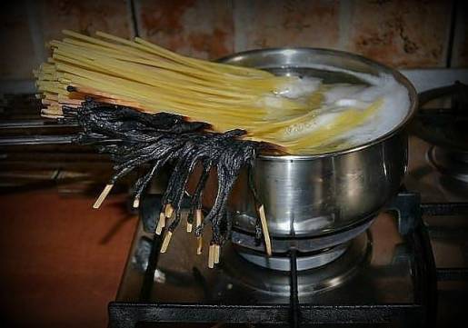 Просто вермишель нужно было поломать помельче, чтобы она не перевешивалась через край кастрюли.
