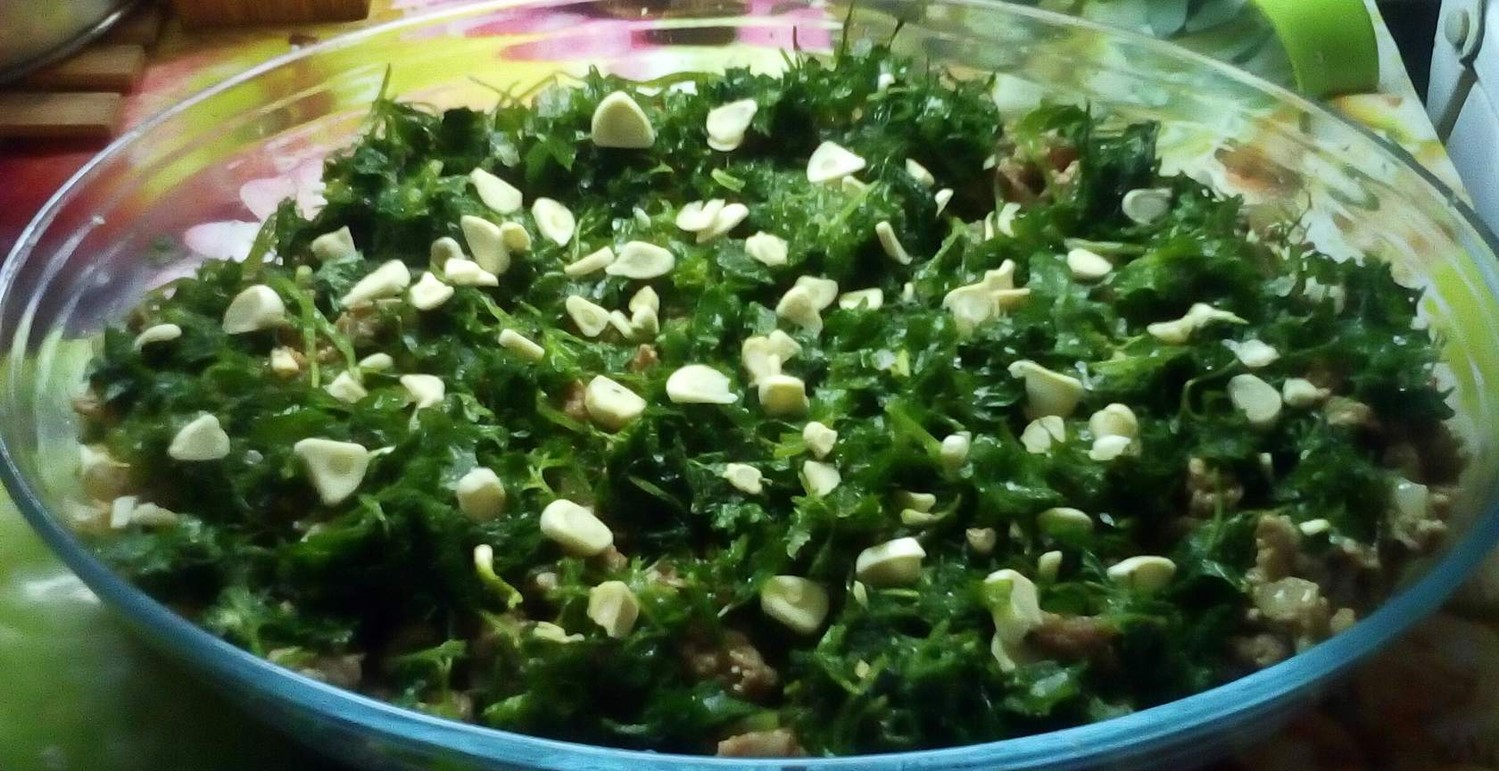 Вторым слоем выкладываем фарш, обсыпаем сыром тертым, чесноком.