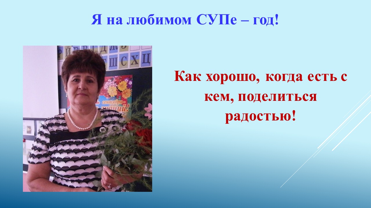 Счастлив в своей судьбе тот, кому встретился учитель, умеющий принести в класс увлечённость, любовь и, конечно же, знания, освещённые этой любовью. Я – одна из этих счастливчиков, потому что одна моя учительница была именно таким светлым, одухотворённым человеком. И уже тогда, в далёком детстве, я мечтала быть на неё похожей, и выбором своей профессии я обязана ей.