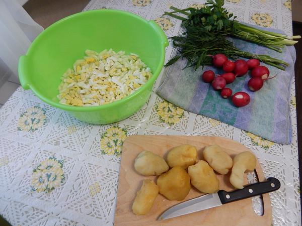 Ингредиенты: хлебный квас, 7 картофелин средних размеров, отваренных в мундире, 5 яиц, сваренных вкрутую, 500 г отварного мяса (конина), 3 средних огурца, свежая редиска (10-13 штук), пучок укропа, пучок петрушки, 3-4 стрелки зеленого лука, соль по вкусу, столовую ложку сметаны на порцию.