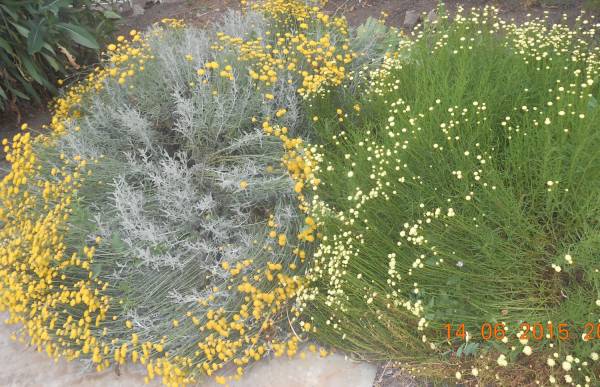 Кипарисовидная сантолина имеет серовато-серебристый цвет листьев и желтые шаровидные цветы.