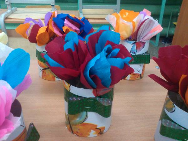 28 ноября в нашей школе праздновали День Матери. К мероприятию мои детишки подготовились серьёзно. В течение недели создавали своими руками цветочные букеты для любимых мамочек. Подарок смотрится очень эстетично, а делать совсем несложно. Весной будем праздновать ещё один мамочкин праздник - 8 марта. Попробуйте смастерить такой подарок и с вашими учениками. А понадобится картон, обои на клейкой основе, гофрированная бумага, веточки деревьев, тонкая проволока, а дно стаканчика вырезали из потолочной плитки. Творческих успехов, коллеги!