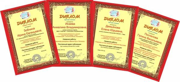 Получены результаты дистанционного конкурса. Как же я порадовалась, когда увидела имена победителей! Одно первое место и три третьих в разных номинациях! Считаю, что в этом немалая роль может быть отведена работе победителей на сайте Международный Современный Учительский портал. Именно здесь можно научиться создавать разработки в соответствии с рекомендациями, получить советы и ответы на вопросы. Поздравляю всех победителей! Хорошее начало нового 2015 года!