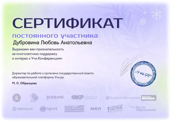 признательность за многолетнюю поддержку и интерес к Учи.Конференциям. Директор по работе с органами государственной власти образовательной платформы Учи.ру 2026 год